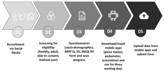 Utilizing an online survey platform, data were gathered. Before completing the questionnaires, participants gave their informed consent. Participants in the study had the choice of manually entering their results or using the export feature to upload the unprocessed data from their activity tracking apps. Participants had to keep track of their screen time, pedometer steps, and sleeping habits for three straight working days as part of the study’s protocol. The three apps’ default modes automatically computed the means to help participants complete their tasks. The data collection flowchart is shown in Figure 1.