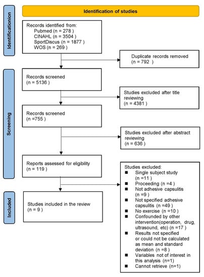 A comprehensive literature search was performed to identify peer-reviewed articles. We systematically searched PubMed, CINAHL, SPORTDiscus, and Web of Science electronic databases for papers published from January 2000 to November 2021. The period of collection and screening of papers was from June to November 2021. We used a keyword search and the medical subject headings vocabulary. The search was limited to studies involving humans, written in English, and reported in peer-reviewed journals. The search terms were as follows: adhesive capsulitis, frozen shoulder, frozen shoulders, adhesive capsulitides, shoulder, periarthritis, stiff, shoulder stiffness, contracted, restricted, peri capsulitis, shoulder pain, fibrosis, irritative, AND exercise, sport, sports, training, stretching, rehabilitation, intervention; NOT calcific tendinitis, rotator cuff tear, rotator cuff rupture, SLAP, labral tear, labral rupture, biceps tendinitis, Bankart, impingement, tear, and rupture. We limited the scope of the search to the case where the full text was retrieved from each database. In addition, while using PubMed, we searched by setting “Article Type” to “Randomized controlled trial” and “Clinical Trial”, and “Books and Documents”, “Meta-Analysis”, “Review”, and “Systematic review” set to exclude. In CINAHL and SPORTDiscus, we set “Source Types” to “Academic Journals”, in Web of Science we set “Document Types” to “Articles”, and in “Quick Filters” we set “Review Article” and “Early Access” to exclude. A manual search for relevant references was performed on all systematically retrieved studies, and the identified articles were screened by two independent authors (J.H.L. and H.G.J) who specialize in sports rehabilitation.