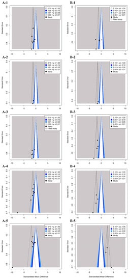 Funnel plots of standard error by each shoulder range of motion for the studies included in the meta-analysis. Funnel plots of exercise effect on flexion (A-1), extension (A-2), internal rotation (A-3), external rotation (A-4), and abduction range of motion (A-5). Funnel plots combination effect on flexion (B-1), extension (B-2), internal rotation (B-3), external rotation (B-4), and abduction range of motion (B-5).