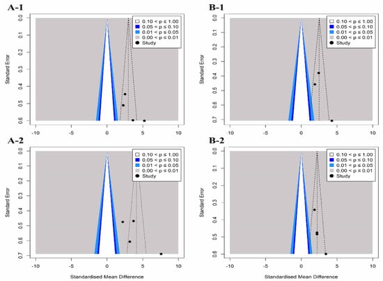 Funnel plots of standard error by each patient-oriented outcome for the studies included in the meta-analysis. Funnel plots of exercise effect on subjective function (A-1) and pain (A-2). Funnel plots of combination effect on subjective function (B-1) and pain (B-2).