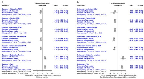 Summary of meta-analysis results. Effect of exercise (A) and combination effect of exercise and joint mobilization (B).