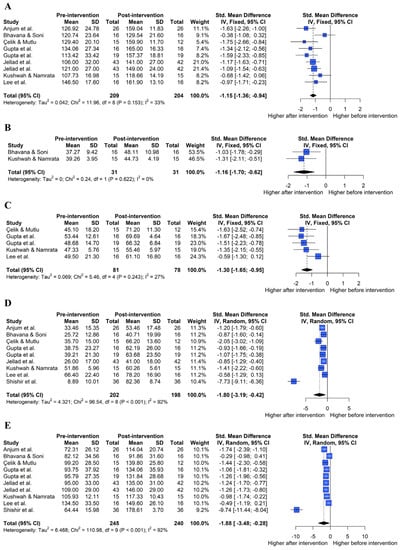 Effect of exercise on shoulder range of motion in forest plots of the meta-analysis. Flexion (A), extension (B), internal rotation (C), external rotation (D), and abduction range of motion (E) [22,29,30,31,32,33,34,36].
