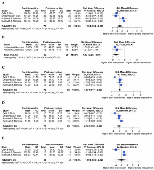 To calculate the standard mean difference (SMD) and 95% confidence intervals (CIs), means, standard deviations pre-and post-intervention, and numbers were extracted from each study. The review process was performed by assessing the aims and quality of the studies, characteristics, inclusion and exclusion criteria of the subjects, intervention procedures, and outcome variables. The significance of heterogeneity varied depending on the I2 value: high (≥75%), medium (≥25%, <75%), and low (<25%). A random-effects model was used in the meta-analysis to generalize the results of the independent studies. We used R-Studio software (Version 4.0.2, R-Studio, Boston, MA, USA) with the “metafor” package to calculate SMD and assess publication bias through forest and funnel plots. Cohen’s d was used to calculate and determine the effect size [28]; the CIs for the effect size was 95%, and the significance level was 0.05. A fixed-effects model was used to estimate the overall effect when homogeneity test statistics were insignificant. When the heterogeneity was p ≤ 0.05, a random-effects model was used, including the restricted maximum likelihood estimation method.