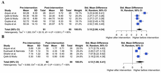 The effect of the combination of exercise and joint mobilization on subjective function was assessed (Figure 8A; k = 3, Q(2) = 8.10, p = 0.017, I2 = 75%). Under the random-effects model, the overall effect of a combination of exercise and joint mobilization on subjective function was statistically significant (SMD = 2.22, 95% CIs = 1.47 to 4.07), indicating that a combination of the two interventions improved subjective function in patients with AC compared to pre-intervention (large effect size).