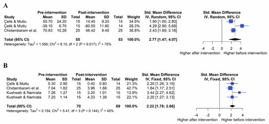 The effect of the combination of exercise and joint mobilization on flexion ROM was assessed (Figure 6A; k = 4, Q(3) = 14.35, p = 0.002, I2 = 79%). Under the random-effects model, the overall effect of a combination of exercise and joint mobilization on flexion ROM was statistically significant (SMD = −1.50, 95% CIs = −2.34 to −0.65), indicating that a combination of the two interventions led to the improvement of flexion ROM in patients with AC compared with pre-intervention (large effect size).