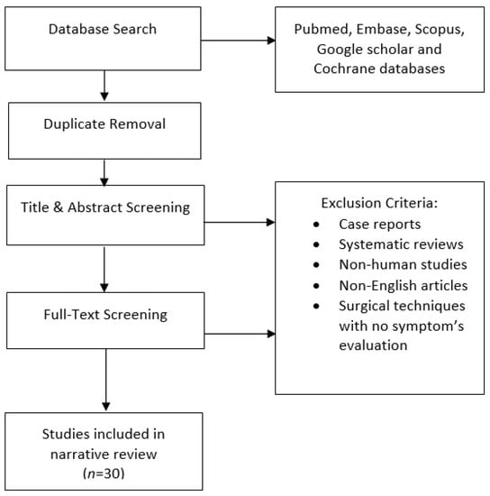 A literature search was performed using the Pubmed, Embase, Scopus, Google Scholar, and Cochrane databases to find correlations between POP and LUTS, using as mesh terms “pelvic organ prolapse” and “lower urinary tract symptoms”. The literature review was conducted independently by two authors (GM and DL). Additional relevant articles that were cited in these original articles were added. Case reports, systematic reviews, non-human studies, and non-English articles were excluded. In addition, articles that focused on practical surgical techniques with no symptom evaluation were excluded. Figure 1 describes the search steps and screening procedure. In this narrative review, we focused on the topics in the subsequent sections: