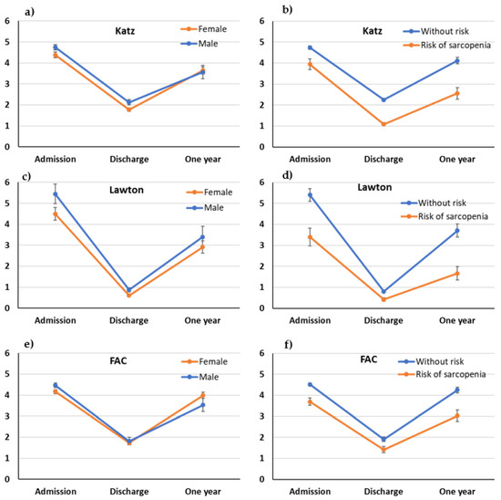 Change in functional tests (Katz: (a,b); Lawton: (c,d); and FAC: (e,f) respectively) over time according to sex and risk of sarcopenia (dots represent mean score, and bars represent a standard error).