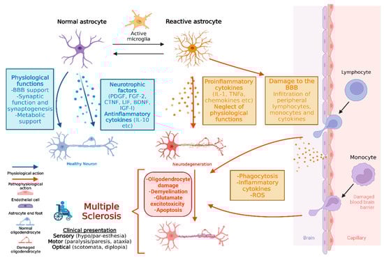 MS constitutes an inflammatory autoimmune demyelinating disease of the CNS, where there are two main forms: (1) relapsing-remitting, with the inflammatory element predominating, gradually leaving neurological deficits; and (2) the progressive form, with either a primary continuous and mainly degenerative course with a poor prognosis, or a secondary neurodegenerative transition following a protracted period of relapse []. However, it has recently been argued that MS can be more accurately defined as a continuum with variable pathophysiological outcomes operative across the duration of the disease in individuals that are impacted in accordance to their specific genetic and environmental risk factors, along with the capacity to compensate for these through plasticity and remyelination []. Regarding the classical clinical presentation, it can vary with sensory (paresthesia, hypoesthesia), motor (paresis, spasticity, ataxia, and tremor), orthostatic, and visual (scotomata, diplopia) disorders. As for the pathological characteristics of MS, they include inflammation, demyelination, axonal/neuronal damage, and reactive astrogliosis. Reactive astrocytes take part in the pathogenesis of MS, influencing both oligodendrocytes and neurons [,]. The effects of reactive astrocytes on neurons include both the production of pro-inflammatory/neurotoxic factors and the loss of normal supportive functions. More specifically, astrocyte activation by raised BDNF levels leads to increased nitric oxide production which acts as a reciprocating transmitter causing neurotoxicity []. Additionally, astrocytic IL-6 and granulocyte-macrophage colony-stimulating factor (GM-CSF) production stimulates pro-inflammatory microglia, displaying the importance of bidirectional crosstalk between different CNS cell types []. Furthermore, the loss of normal functions, such as glutamate uptake and potassium buffering, as a result of the diminished expression of their respective transporters, such as the excitatory amino acid transporters (EAATs) and inward rectifying K+ channels, disorganizes the neuronal environment and induces excitotoxicity []. Lastly, the derangement of the aforementioned astrocytic metabolic provision of lactate and cholesterol also assists neurodegeneration []. Furthermore, reactive astrocytes produce a plethora of factors which influence oligodendrocyte and OPCs, as mentioned above (Table 1). The distinctive MS plaques are classified into active (acute), chronically active (inactive center with active periphery, both characteristics of relapsing–remitting form), inactive (chronic, characteristic of primary progressive form), and early (local perivascular inflammation with BBB breakdown) []. Regarding active plaques, there are hypertrophic astrocytes with extended branches rich in GFAP [,]. At the molecular level, there is an increased expression of GFAP and other structural proteins (such as vimentin) as well as an increased production of inflammatory molecules and growth factors such as BDNF, CTNF, and IGF-1 [,]. In addition, elevated levels of glutamate are found (indicative of changes in its transport mechanisms) causing excitotoxicity []. The inactive plaques appear to contain milder reactivity with smaller and fewer branched astrocytes surrounding degenerated axons [,]. Finally, in chronically active plaques, peripheral inflammation and demyelination envelop the central oligodendrocytes to prevent remyelination [] (see Figure 1).