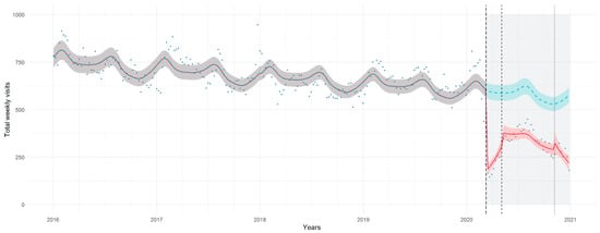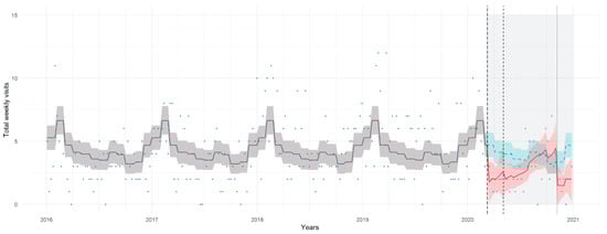 Count of total visits per week (y-axis) during the examined years (x-axis); the pandemic months are highlighted in light grey, with the start of the first lockdown, post-lockdown and second lockdown marked by vertical lines (longdashed, dashed and dotted, respectively). Observed counts are represented by dots; the chart shows the estimated trends for the study model (red dashed line) and the counterfactual scenario of the predicted number of weekly visits assuming the pre-pandemic pattern continuing in the pandemic period (green dashed line). Shadows represent 95% prediction intervals.