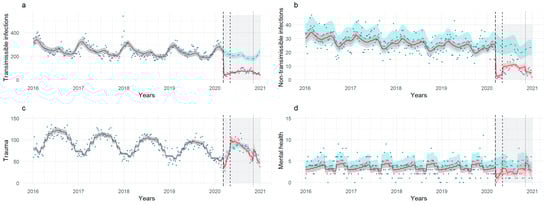 Count of weekly visits for each etiological category: transmissible infectious disease (a), non-transmissible infectious disease (b), trauma (c) and mental health (d). The start of the three pandemic stages is marked by dashed/dotted lines. The pandemic months are highlighted in light gray; trendlines for the study model (red) and the counterfactual scenario (green) are shown. Shadows represent 95% prediction intervals.
