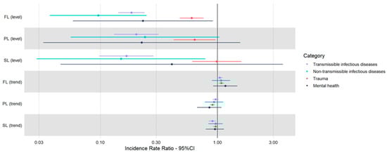 Forest plot of incidence rate ratios (IRR) from an interrupted time-series models expressing changes in level and trend during pandemic stages for each etiological category. FL: first lockdown; PL: post-lockdown and SL: second lockdown.