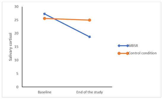 Table 2 reports the descriptive statistical indices of symptoms of stress and depression, and cortisol and CK concentrations for the MBSR and the active control condition, both at the baseline and at the end of the study. Table 3 reports the inferential statistical indices (ANOVAs for repeated measures with the factors time, group, and time by group interaction).