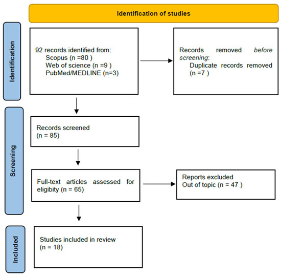 A systematic literature search retrieved 92 studies. From 92 records, 18 articles were included in the review. Details regarding the selection process are summarized in a custom-built PRISMA flow chart in Figure 1. Basic data on the research works included in this systematic review are collected in Table 1. Moreover, this paper also presents a clinical case of a 51-year-old male patient after rhinectomy with a nasal prosthesis mounted on anchored implants.