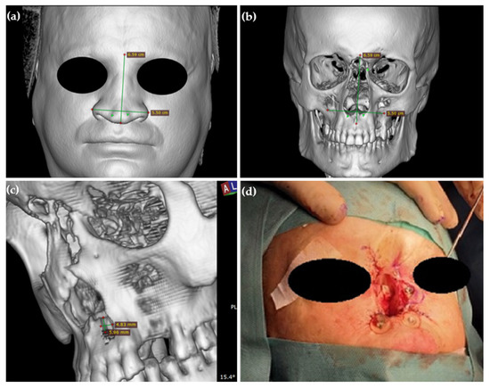 During the planning and qualification of the patient for such an operation, attention must be paid to the condition of the bone in which the implants are planned to be fitted. It is also very important to cooperate with a prosthetist, so that together they can plan the best location for the implants, both in terms of the stability in the bone and the fitting of the prosthesis. This is why several specialists are involved in the surgical planning stage: surgeons, clinical engineers, prosthetists and radiologists [29]. Pre-operative planning should include craniofacial MRI and CT scan analysis, 3D reconstructions of the craniofacial bones, clinical examination of the nasal deformity, endoscopy and rhinoscopy. Pre-establishment of implant sites is crucial, during which consideration is given to: