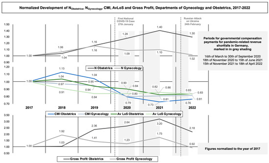 To allow for comparison of dissimilar economic and epidemiological data of the departments over the entire period under consideration, the base data of patient number (NObstetrics, NGynecology), AvLoS and CMI from Section 2.2.1 as well as Gross Profit from Section 2.2.2) were normalized to the first observed year, 2017. Subsequently, an aggregated graphical visualization of the corresponding development was realized by using PowerPoint (Version 16.66.1, Microsoft Corporation, PA, USA). The graphic was combined with the dates of the first registered COVID-19 case in Germany (27 January 2020), the Russian-Ukrainian conflict onset (24 February 2022), as well as time periods for aforementioned governmental compensation payments for pandemic-related revenue shortfalls in Germany (16 March 2020 to 30 September 2020, 18 November 2020 to 15 June 2021, 15 November 2021 to 18 April 2022).