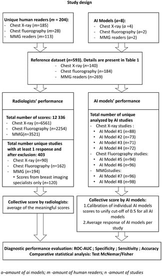 Since variations in radiologists’ performance are widely observed, they can lead to different results in the comparison between radiologists and AI. This may compromise the objective assessment of a particular AI model, or lead to a misjudgment of the benefits and limitations of AI for the whole field of medical imaging. Therefore, multicenter and international studies with different groups of radiologists are of particular interest for the benchmarking of AI and human readers. A study carried out among 101 radiologists from 7 countries demonstrated that the precision of the AI model accuracy for identifying breast cancer with mammography was comparable to that of an average radiologist [13]. Another major study with more than 1100 participants from 44 countries revealed that none of the AI models could outperform radiologists, but the combination of a single reader evaluation with AI results improved the total accuracy of screening mammography [4]. A recent international study demonstrated that an AI model could exceed the average performance of mammography specialists, but the comparison was performed for a relatively small group of six readers [14]. Undoubtedly, larger international studies are needed in order to establish an unbiased comparison of AI and human readers’ performance. This study aimed to determine the average diagnostic accuracy of radiologists interpreting chest X-ray images, including those from fluorography and mammography, on an international scale for benchmarking with the stand-alone AI model’s performance metrics for the same cases.