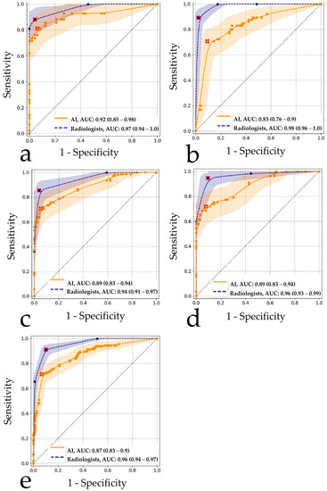 Comparing the average results of the eight AI models, as well as an average assessment of radiologists’ performance, the significant differences (p < 0.05) in the AUROC values of 0.87 (0.83–0.9) for AI algorithms vs. 0.96 (0.94–0.97) for radiologists were obtained (Figure 3e, Table 2). For the cut-off values calculated by Youden’s method, lower values of sensitivity and specificity (95% CIs did not intersect) were detected for AI than for radiologists. Comparison of radiologists’ performance with AI revealed the best match with the group of least experienced radiologists (p = 0.65) (Table 2). Diagnostic accuracy metrics per AI model are shown in the Supplementary Materials (Table S2).