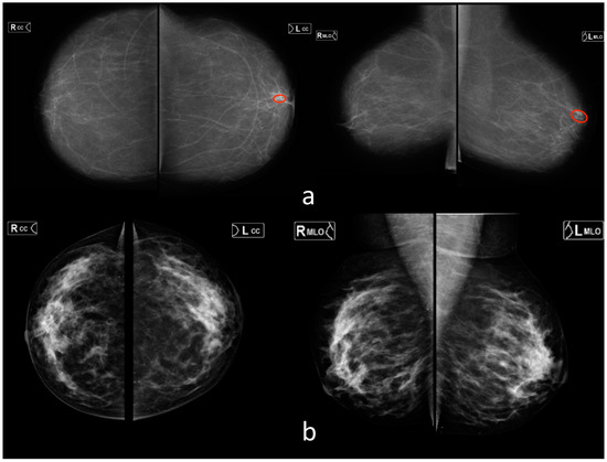 Examples for mammography (a,b). (a) AI missed a cluster of retroareolar microcalcifications in the left breast (red markup). Radiologists correctly marked this case as pathological. (b) Areas of disseminated breast fibroglandular tissue (type C according to ACR) were mistakenly interpreted by breast imaging specialists as suspicious for malignancy. AI did not detect pathological changes.