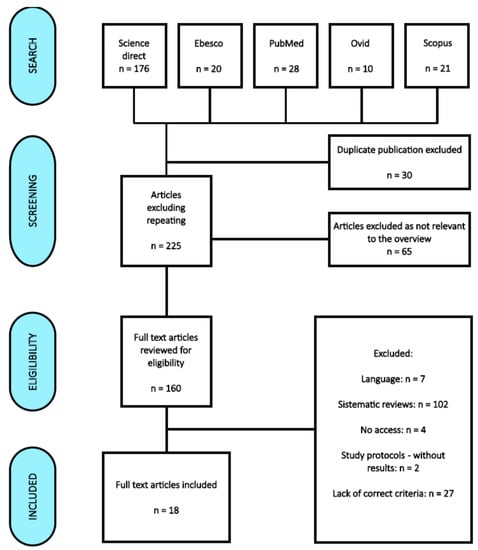 The following databases were searched: Science Direct, EBSCO, PubMed, Ovid, and Scopus. The keywords used were “music”, “pain”, “intensive care”, “delirium”, or combinations of these using AND or OR operators. A total of 255 articles matching the primary search criteria were found, 160 of which were included in the further analysis, which included the verification of the availability of full-text versions and their compliance with the inclusion criteria. The last search was conducted on 8 January 2023. Finally, 18 articles published from 2010 to 2022 were submitted for our review. The review and qualification of articles for further analysis were possible after meeting the inclusion criteria.