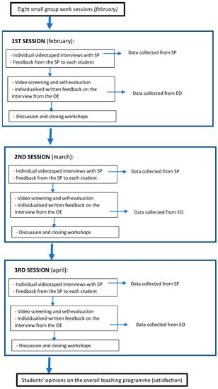 The SPs evaluated the same item (overall impression), giving their impression of the interest shown by the interviewer (the student) in their viewpoints and emotions (Likert scale from 0 to 10 points). Finally, using an electronic online questionnaire, the students’ opinions on the overall teaching programme (satisfaction) and the usefulness of the tested strategies (Likert scale from 0 to 5 points: from 0—“not useful at all” to 5—”totally Useful”) were recorded.