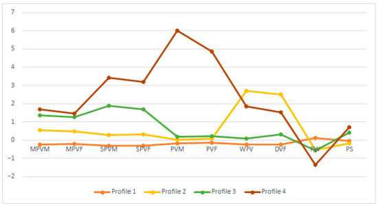 Profiles of adolescents according to their involvement in child-to-parent violence and family variables. Note: MPVM = moderate psychological violence against mother; MPVF = moderate psychological violence against father; SPVM = severe psychological violence against mother; SPVF = severe psychological violence against father; PVM = physical violence against mother; PVF = physical violence against father; WFV = witnessing family violence; DVF = direct victimization in the family; PW = parental warmth; PS = permissive style.