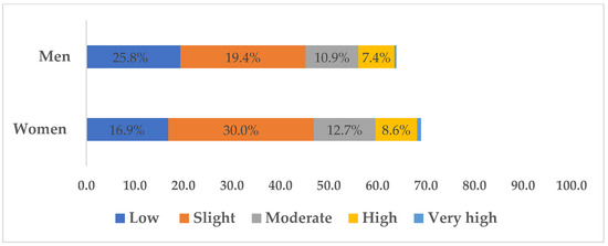 Figure 1 presents the risk of developing T2D in the next 10 years with an association with sex (p < 0.001) having a small effect (V = 0.1). Men showed a higher number of cases of slight risk, with 698 individuals, followed by low risk (n = 524) and moderate risk (n = 296). A high and very high risk of T2D was observed in 200 and 10 individuals, respectively. The same trend was observed in the most prevalent risk bands in women: low risk (n = 653), slight risk (n = 1160), moderate risk (n = 491), high risk (n = 334), and very risk (n = 29).