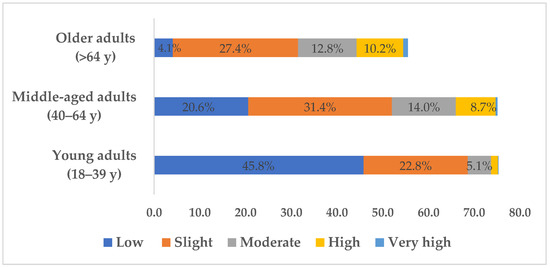 Figure 2 shows the risk of developing T2D in the next 10 years within those age groups (p < 0.001) with a moderate effect (V = 0.3). We found that the “low risk” score decreases with age, with a value of only 4.1% in the older adult group. The moderate, high, and very high-risk scores increase sharply from young adults to middle-aged adults.