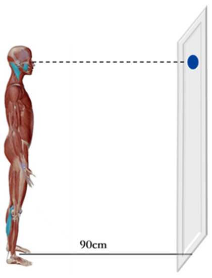 Subjects were asked to maintain Romberg posture (standing still with arms naturally positioned at the sides of the trunk) and to gaze at a 1 cm diameter circular mark on the wall at a distance of 90 cm with both eyes (Figure 2). The experiment was conducted in a quiet and undisturbed environment throughout [26]. The subjects were instructed to complete the above three movements simultaneously, the 5-s sEMG at the time of stabilization of each movement was recorded, and the middle 3 s were selected for statistical analysis. The amplitude of EMG activity (in μV) of each muscle was recorded in root mean square (RMS) and repeated three times for each occlusal position, with a 5 min break for each test. The EMG amplitudes of the MM, SCM, LGA, and MGA were measured in three different occlusal positions, as follows: bilateral (BCR), left (LCR), and right posterior teeth placement of cotton rolls (RCR) for clench with force. (The cotton roll is 19 mm long and 10 mm in diameter) [10].