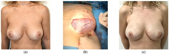 Thirty-five year-old woman with mutation in BRCA 1 gene who underwent bilateral risk-reducing nipple-sparing mastectomy with inframammary fold approach and subsequent prepectoral direct-to-implant reconstruction with ADM-wrapped implants. (a) Preoperative view; (b) intraoperative view of the left breast showing the acellular dermal matrix wrapped around the implant and anchored to the pectoralis major fascia; (c) postoperative view at 6 months.