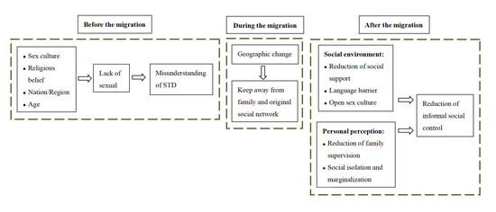 This study has explored the social and behavioural factors contributing to the risk of STI transmission within the international floating population (Figure 1). Unresolved language barriers at the personal level and the lack of related services at the structural level (such as insufficient medical services, the difficultly of access to information, and inadequate sexual health education) have exacerbated the complexity of STI vulnerability. At the social level, geographical separation from one’s original family and social network leads to the expansion of personal space; accordingly, the ability of migrants to cope with STI-related risks is also challenged. In addition, marginalised social status, a sense of isolation, and a sudden reduction in informal mechanisms of social control all further challenged the abilities of migrants to cope with the risks of STI. The spiritual and cultural aspects should also not be ignored. In line with earlier studies [23,25], we found that sexual culture had a determinative influence on STI risks. Before and after migration, religious beliefs and cultures continuously affected the formation of a sexual culture, the engagement with sexual health education, and the immigrants’ understanding of STIs. Other studies have shown that Muslims had less knowledge about STIs compared to other religious groups [26,27]. Our study confirmed that a conservative sexual culture, a lack of sex education and misunderstandings of STIs partly increased the risks of STI transmission.