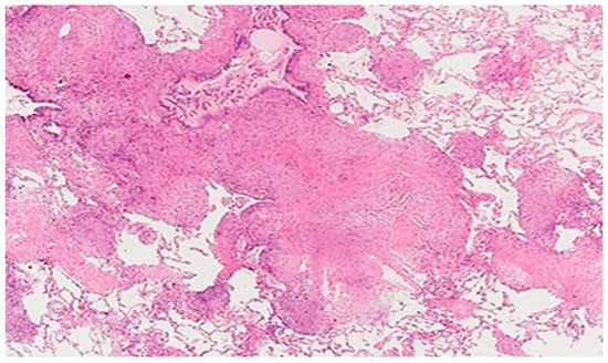A functional respiratory study was not performed, nor was a mycobacterial study [29] through the PCR technique or Grocott stain for fungi (the gold standard to rule out infection), as the patient did not present clinical symptoms or impairment of the general condition.
