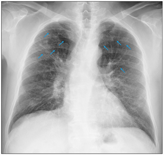 Pulmonary involvement is characterised by radiographic images of nodular opacities from 2 to 3 mm and is often distributed diffusely and uniformly in both lungs, with a slight predominance in the lower lobes.