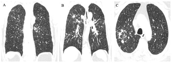 (A) Diffuse, segmentally distributed micronodular disease more predominant in the middle thirds. (B,C) Larger sized qualified nodules in the right upper lobe, other dense and irregular nodules in both lower lobes, with the most significant in the paraspinal cortex of the apical segment of the right lower lobe of 9 mm.