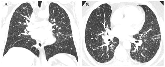 (A) Innumerable ground-glass nodules of perilymphatic and centrilobular distribution. (B) Some larger nodules in the peribronchovascular situation and with linear/reticular opacities.