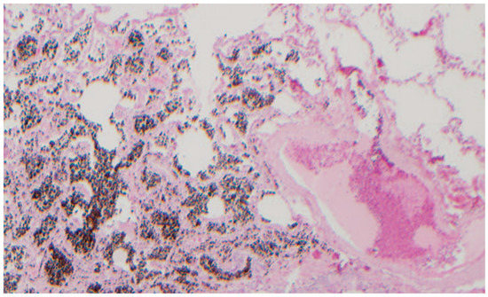 An anatomopathological study was performed (open lung biopsy), which confirmed the presence of high iron content in the macrophages and in the peribronchovascular interstitium (Figure 8). A functional respiratory study was completed, concluding with a mild restrictive spirometric pattern.