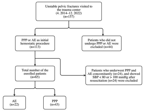 This retrospective study was approved by the institutional review board of Wonju Severance Christian Hospital (IRB no. CR 321179). Medical data of trauma patients were collected from the Korean Trauma Data Bank from 1 April 2014 to 31 December 2022. The data were collected prospectively and analyzed retrospectively. Informed consent was waived because the data were analyzed anonymously. Patients were included in the study if they: (1) visited our trauma center owing to a hemodynamically unstable pelvic fracture (systolic blood pressure [SBP] < 80 mmHg); (2) were aged ≥ 18 years; and (3) agreed to the collection and use of their medical information. Hypotension at initial presentation was defined as SBP < 80 mmHg at the initial emergency department (ED) visit, based on our treatment experience for hemodynamically unstable patients with pelvic fractures. The exclusion criteria were as follows: (1) resuscitation without an initial hemostatic procedure, (2) concomitant PPP and AE, and (3) SBP <80 or >100 mmHg after resuscitation. Based on these criteria, 65 patients were enrolled in this study. The enrollment process for patients with trauma is summarized in Figure 1.