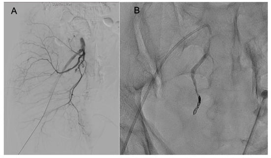 Angiography for a patient with a hemodynamically unstable pelvic fracture. (A) Angiography showed contrast extravasation from the pudendal branch of the internal iliac artery, and (B) the pudendal branch was selected and embolized with a coil.