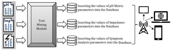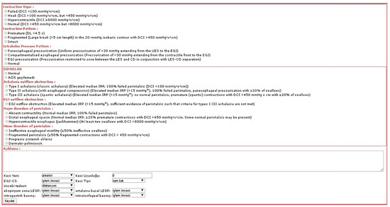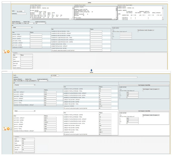 In this large and comprehensive database, patients with GERD and reflux motility problems were recorded, including details of their history, upper gastrointestinal endoscopy reports, questionnaire scores, classical or high-resolution esophageal manometry data, radiology reports, consultation reports, reflux council notes, medication doses and durations, and 24 h impedance–pH monitoring, such as their bravo capsule pH monitoring results. As a result, a decision support software package that allows examinations, questionnaires, and scores to be stored in the database, accessed upon request, decided on by the physician, and analyzed, has been created. As computer applications that make an automatic diagnosis are becoming widespread nowadays, the results of the multi-parameter pH monitoring, impedance, and symptom analysis obtained automatically over MMS (Medical Measurement Systems, The Netherlands) can be transferred to this database, as in Figure 1, and a diagnosis based on pH monitoring–impedance can be made (e.g., pH monitoring is pathologic, while impedance is normal; impedance is pathologic, while pH monitoring is normal; both of them are pathologic; pathological acid reflux; impedance is upper bounded, while pH monitoring is pathologic; etc.). As a result, the data introduced by this software via copy–paste and text parsing methods are automatically separated into 48 parameters and, thus, can save users a lot of hard work.