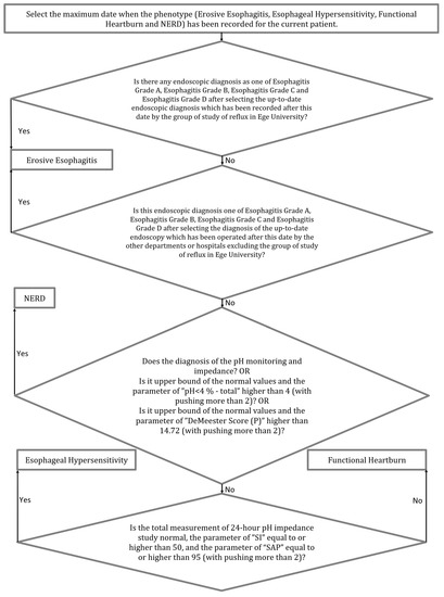 In our study, four GERD phenotypes can be automatically detected using the algorithm integrated into the system, as shown in Figure 3. Endoscopy examinations have been performed in many medical centers; therefore, the up-to-date endoscopy procedures used by the group studying reflux at Ege University are used by the developed system to determine the GERD phenotypes. If the endoscopy examination is not performed at Ege University, the most recent endoscopy examination procedure used by this other center is evaluated.