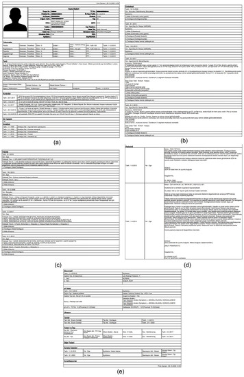 A general overview of the examinations, the parameters, and their results for a sample patient: (a) history, complaints, controls, additional diseases, and operations; (b) endoscopic values; (c) pathologic values; (d) radiologic values; (e) manometric values, pH monitoring, ultrasound results, diagnosis, medicine, other treatments, council decisions, and consultations.