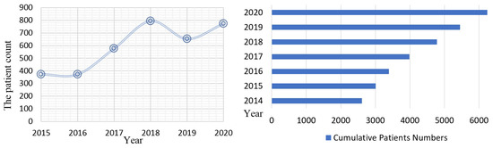 Figure 7 shows the distribution of the number of patients from January 2015 to March 2020. The developed system started to store patient data in the database in 2017. The number of patients included in 2015, 2016, 2017, 2018, and 2019 was 373, 372, 577, 794, and 652, respectively. The number of patients included in January and February 2020 was 129; so, for all months in 2020, we predicted that 129 × 6 = 774 patients could be stored in the database. Thus, it is noted that, since a transition to using the developed system in 2017, it has been observed that the number of patients, which was around 400 beforehand, increased to 800.