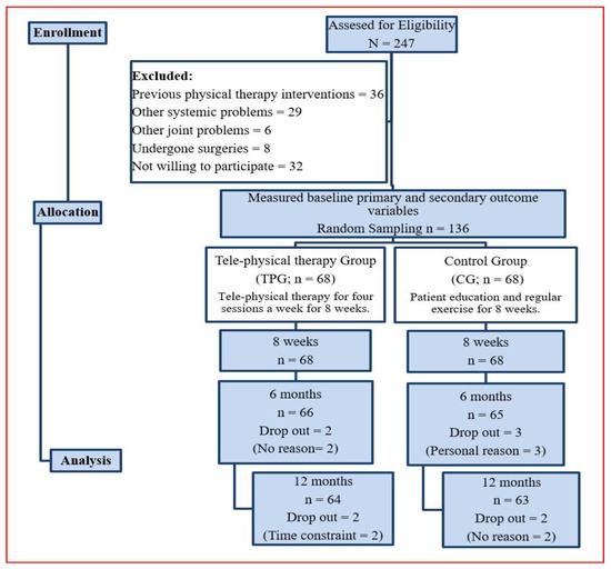 Prior to participants’ enrollment in the study, a general physician evaluated 247 participants according to the eligibility criteria to identify those suitable to be included in the trial. Of the 247 participants, 136 were randomized into either of two groups, the tele-physical therapy group (TPG; n = 68) and the control group (CG; n = 68), through computer generated random number method and the subject numbering was given consecutively as per their enrollment in the study.
