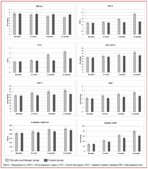 The mixed model repeated measures (4 × 2) (MMRM) of the secondary outcome measures (FEV1, FVC, FEV1/FVC, MVV, PEF, 6MWT, and QOL) were calculated to report statistically significant difference (p < 0.001) among TPG and CG groups at baseline, 8 weeks, 6 months, and at 12 months. The baseline measures did not show any statistical differences (p > 0.05). At the same time, measurements at 8 weeks (FEV1 −0.1 (95% CI −0.13 to −0.06), FVC −0.17 (95% CI −0.22 to −0.11), FEV1/FVC −2.3 (95% CI −3.91 to −0.68), MVV −8.9 (95% CI −10.56 to −7.23), PEF −0.6 (95% CI −0.70 to −0.49), 6MWT −20.4 (95% CI −33.0 to −7.8), and QOL −6.2 (95% CI −7.79 to −4.60)) show statistically significant differences (p < 0.001) among TPG and CG groups. Similar changes were noted after 6 months of intervention and again after 12 months (FEV1 −1.7 (95% CI −3.84 to 0.44), FVC −1.43 (95% CI −1.50 to −1.34), FEV1/FVC −12.1 (95% CI −14.15 to −10.04), MVV −13.7 (95% CI −15.53 to −11.86), PEF −0.9 (95% CI −1.02 to −0.77), 6MWT −37.0 (95% CI −50.7 to −23.4) and QOL −18.9 (95% CI −21.17 to −16.62)) that show the significant differences (p = 0.001) between the TPG and the CG. The statistical reports show improvement for the secondary variables in the TPG vs CG at 12 months’ follow-up, which is displayed in Table 3 and Table 4. The Cohen’s effect size of FEV1 (d = 8.78), FVC (d = 6.50), FEV1/FVC (d = 2.11), MVV (d = 2.34), PEF (d = 2.50), 6MWT (d = 0.92), and QOL (d = 2.84) depict greater effects in the TPG than in the CG. The graphical representation of all of the outcome variables between the two groups is shown in Figure 2.
