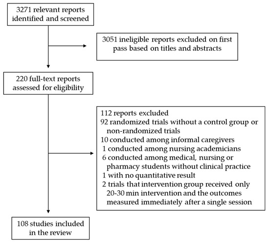 R.S. screened the titles and abstracts of 3271 reports from PubMed search and selected 220 studies for full-text review (Figure 1). We included 108 studies (114 reports, 2 reports from 6 studies) in the review and excluded 112 studies. We excluded 92 trials because they were not randomized controlled trials or they did not have a control group. Of the excluded studies, informal caregivers participated in 10 RCTs and medical, nursing, or pharmacy students or nursing academicians participated in seven RCTs. One trial only reported qualitative results, and two RCTs had only one session of 20–30 min intervention and measured the outcomes of interest right after a single session. The sample size of included RCTs varied from 21 to 2182 individuals. The 108 included RCTs were conducted in the USA (n = 26), Germany (n = 10), the Netherlands (n = 10), Sweden (n = 9), Denmark (n = 6), Turkey (n = 6), China (n = 5), Spain (n = 5), Australia (n = 4), Japan (n = 4), Canada (n = 3), Norway (n = 3), the UK (n = 3), Finland (n = 2), Malaysia (n = 2), Vietnam (n = 2), Belgium (n = 1), Chile (n = 1), France (n = 1), Greece (n = 1), Hong Kong (n = 1), Ireland (n = 1), South Korea (n = 1), and Switzerland (n = 1). Our additional search on factors that influenced participation in workplace interventions identified 760 publications. Out of these, we included five studies in the review.