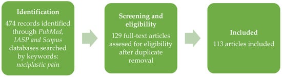 The search was conducted in the PubMed, IASP, and Scopus databases. Of the 474 identified records, 113 articles were included. A simplified flow diagram of study selection is depicted in Figure 1.