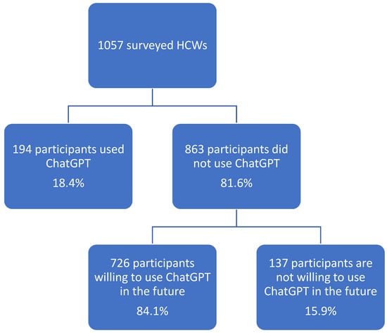 With the new launch of ChatGPT, it is important to explore HCWs’ knowledge and skills as well as their viewpoints on the use of AI in general and of ChatGPT specifically. Such a study sheds light on the future studies needed in this field. Our study found that while only one-fifth of HCWs in our cohort used ChatGPT for medical purposes as of the survey time; still, about half of the respondents were familiar with ChatGPT. As the adoption of ChatGPT expands rapidly and extensively, both locally and internationally, a growing number of healthcare workers are expected to utilize AI Chatbots, which could directly or indirectly influence the dynamics of digital healthcare [].
