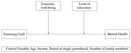 The psychological and emotional difficulties faced by female householders in single-parent families are commonly related to child rearing and economic difficulties [10]. Parenting guilt is defined as the psychological guilt and shame that parents feel during the parenting process [11]. In the context of work-family conflicts, research has focused primarily on working mothers’ maternal guilt for surrogate parenting and day care when they are not physically present with their children [12,13]. Parents from single-parent families feel sorry for their children for being raised in a single-parent family compared to a two-parent family. Factors such as economic burden, work-family conflict, and social stigma make parents of single-parent families feel guilty about parenting. In addition, elevated parenting guilt functions as a negative factor for single parents’ parenting conduct, leading to indifference, neglect, and abuse, which have detrimental effects on the cognitive, psychological, and behavioral characteristics of children [14]. The guilt of being a parent was very strong when a mother had to balance her economic responsibilities with raising her children and when her performance was less than expected [15]. Parenting guilt was the strongest predictor of a mother’s subjective well-being and was a stronger predictor of depression than spouse and friend relationship factors [16]. On the other hand, Lee [17] also suggested that parenting guilt not only causes negative effects on mental health but also looks at positive aspects such as the hope and opportunity for growth that mothers want in contradiction with the current situation. Therefore, considering that guilt is relatively easier for women to feel than it is for men and that the majority of single parents are mothers, it is necessary to examine how parenting guilt can affect the mental health of single-parent women.