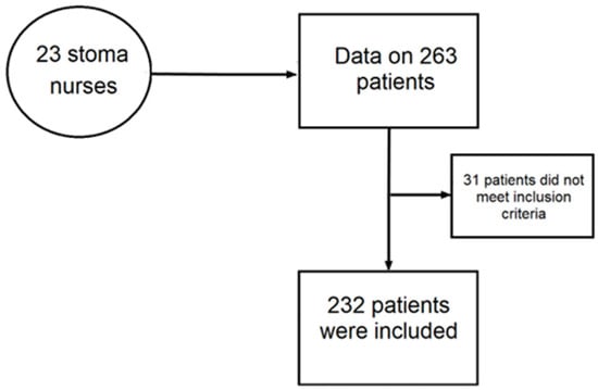A total of 23 stoma nurses participated in the survey, providing data on 263 patients (Figure 1). Each nurse contributed an average of 10 patients (range 7–12). After excluding 31 patients who had less than 4 months of follow-up, the final dataset included 232 patients.