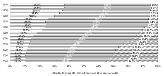 In Japan, the demographic structure has changed over the past century. The proportion of the young population has declined consistently, while that of the elderly population continues to grow, exceeding 21% in 2010 and reaching 29% by 2020 (Figure 1) []. Soon, Japan will face a “population and social security problem”, where the population aged 75 and over is expected to grow to 21.5 million, approximately one in five people of the total population, by 2025. By 2040, it is predicted that 34.8% of the population will be aged 65 years or older, and 19.7% will be aged 75 years or older [].