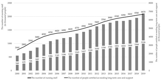The number of nursing staff and people certified as needing long-term care and support (2000–2019). Data source: Ministry of Health, Labor and Welfare [,]. Notes: “The number of nursing staff” is the number of staff engaged in long-term care service establishments and long-term care insurance facilities eligible for long-term care insurance benefits.